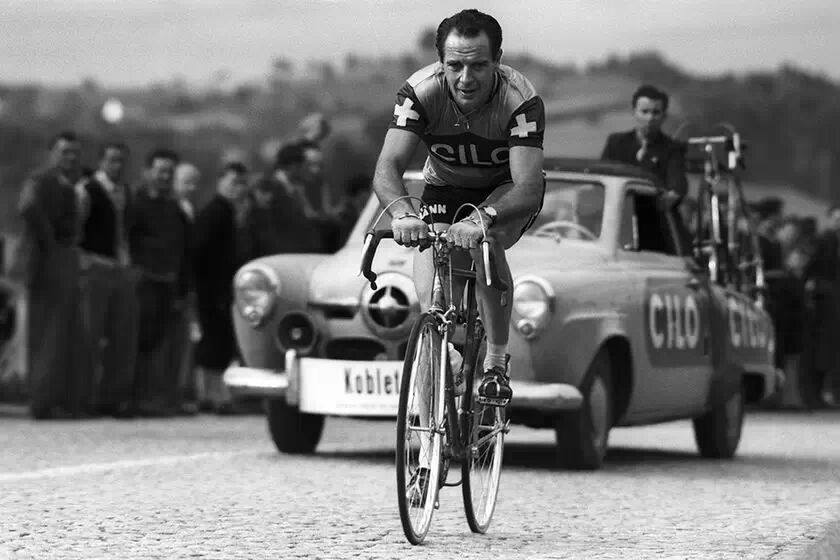 1.1950年的环意,瑞士人雨果·科布莱特(Hugo Koblet)夺得冠军,这也是环意大利的冠军第一次被非意大利人获得。后来的环意中又有两位瑞士人相继夺得过冠军,他们是Carlo Clerici和托尼·罗明格(Tony Rominger)。(图:雨果•科布莱特在比赛中,身穿印有瑞士国旗的骑行服)